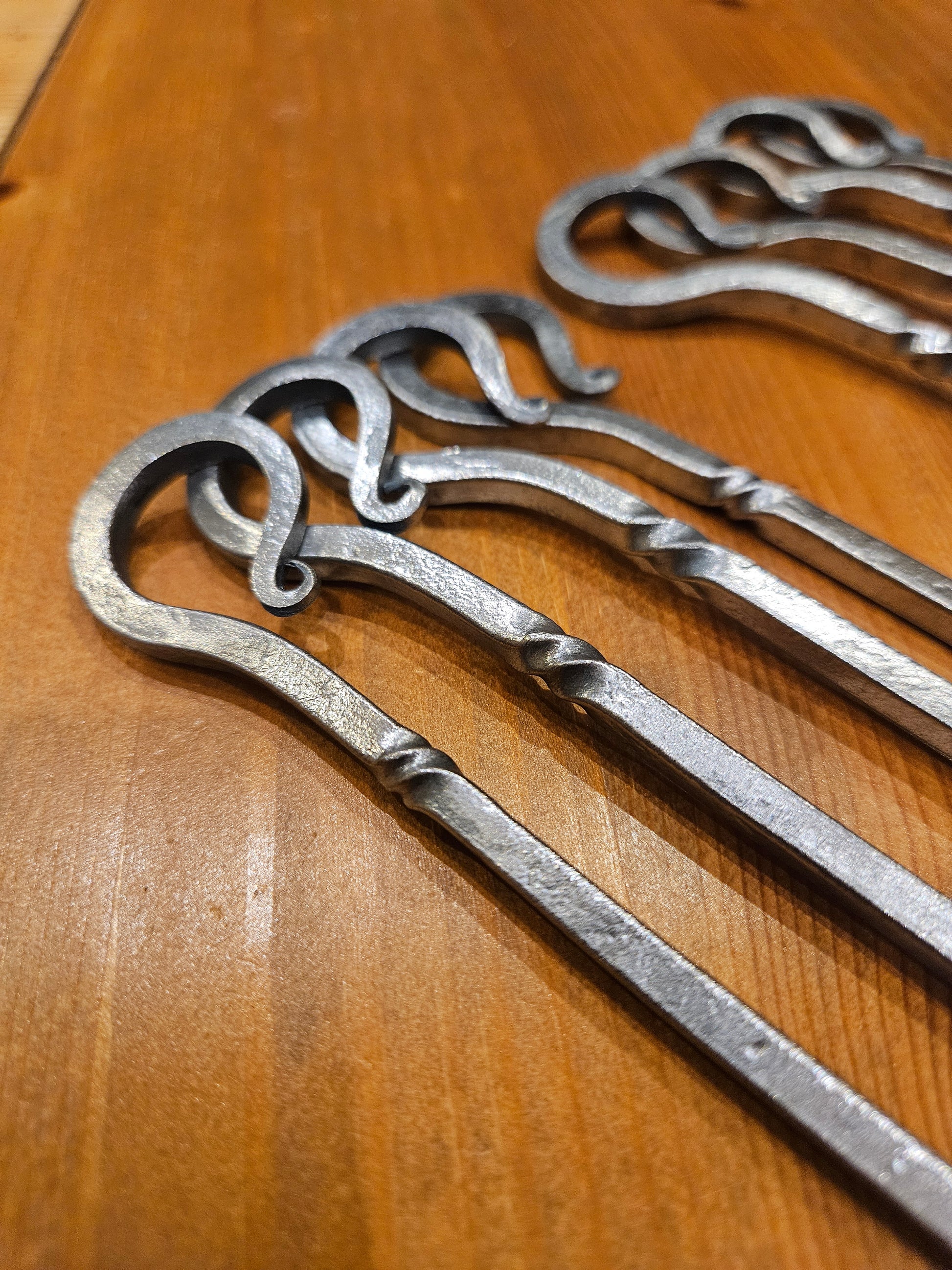 This listing is for 4x BBQ Skewers that are made from hand forged 5mm steel with decorative twists to match the steak flipper BBQ tools I have also made. The twists are not just decorative but stop any meat or veg slipping off the end of the skewer or siding down to your hand when holding it upright.