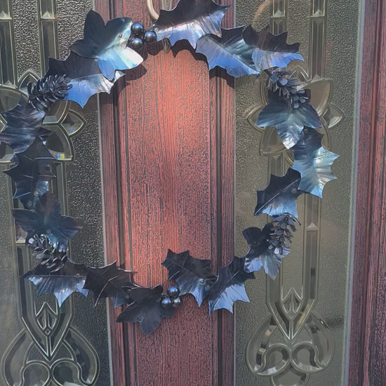 Bring a touch of craftsmanship and timeless style to your home with this hand-forged steel holly wreath. Each leaf, berry, and pinecone is individually shaped, textured, and finished by hand—capturing the spirit of traditional blacksmithing with a modern, elegant twist.