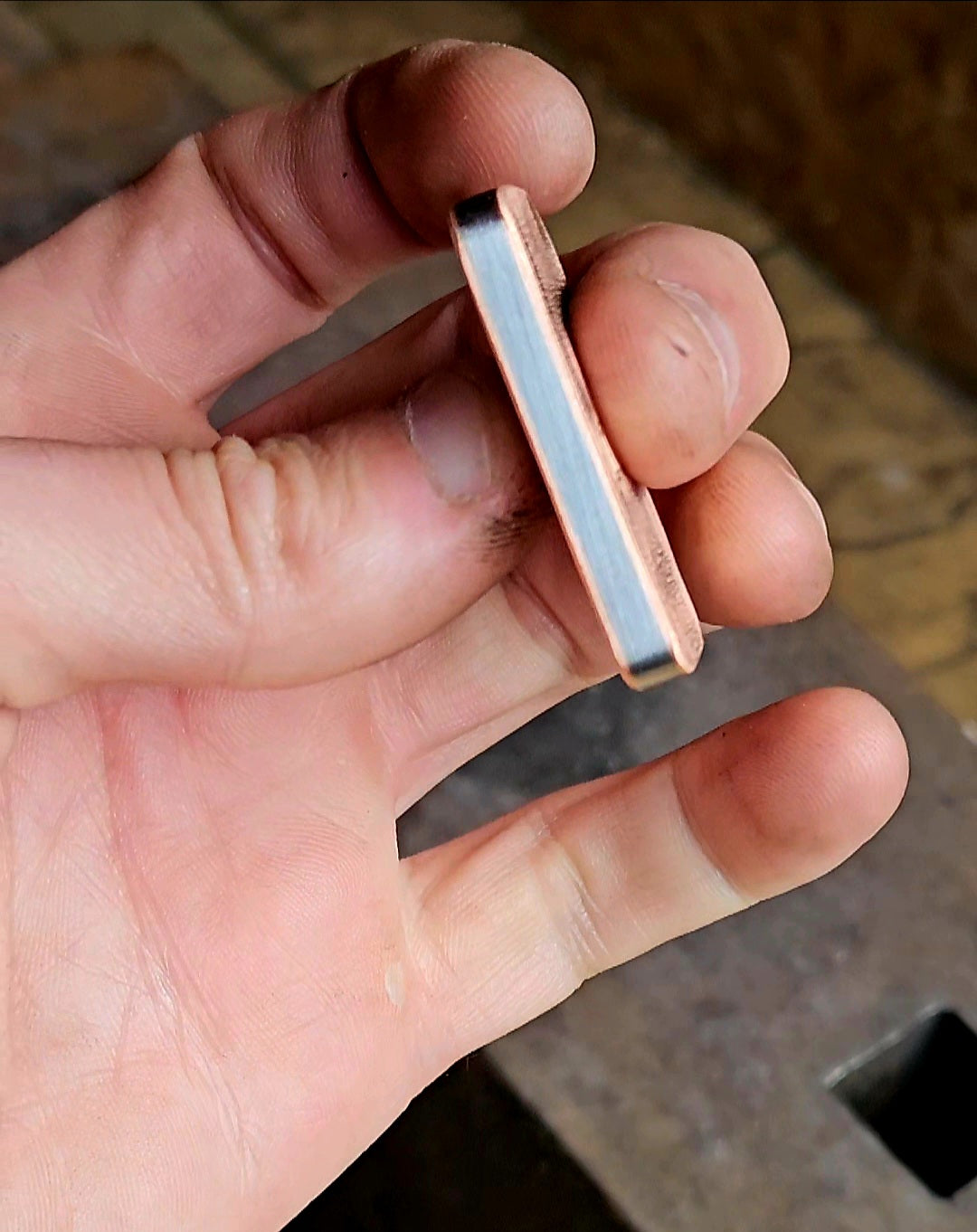 This is a listing for a haptic worry stone sometimes called a touch stone. It is made from a hand forged billet of 1084 steel centre and cladded with copper. I have cut and then flattened it to make a series of one off worry stones.