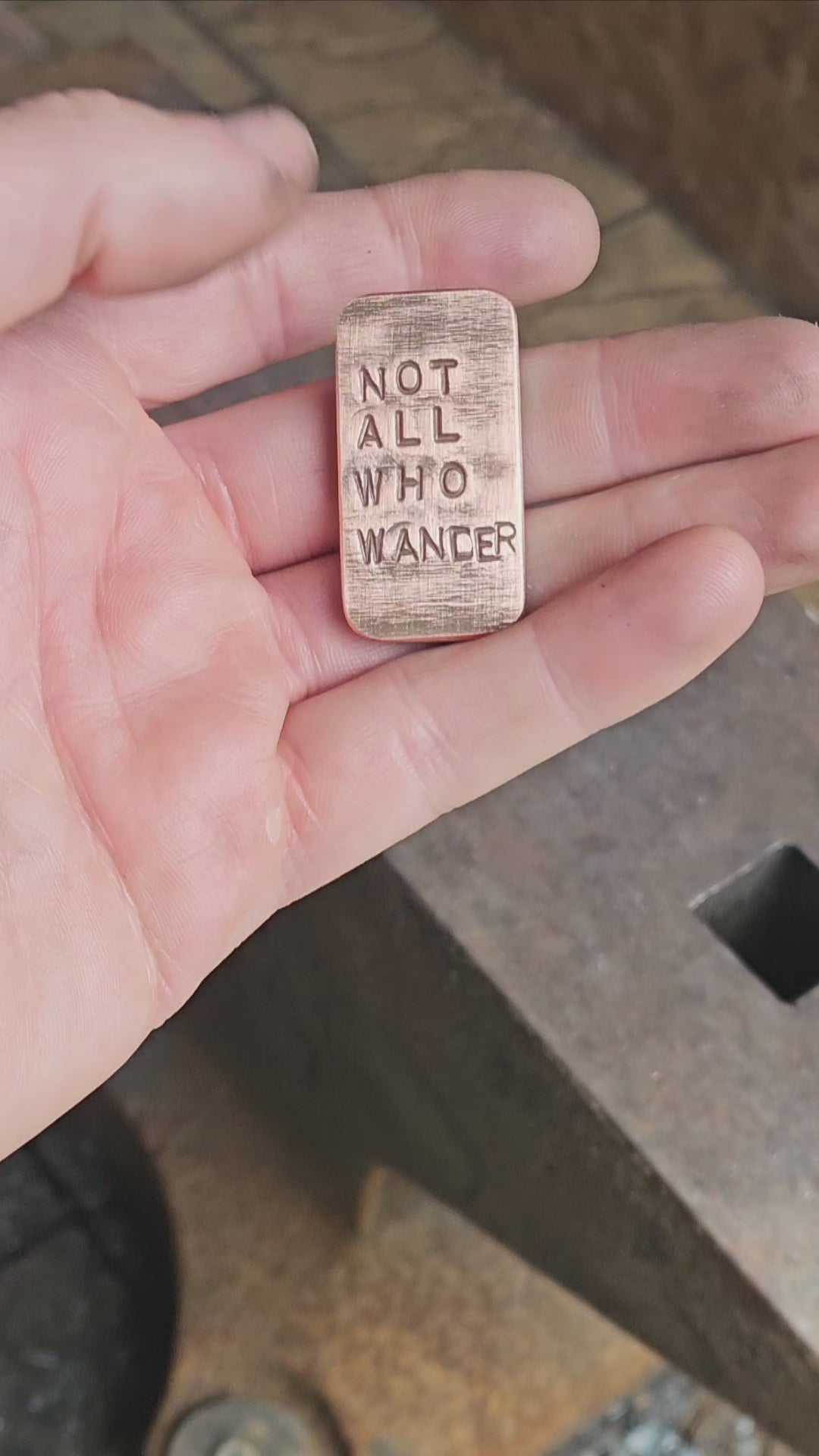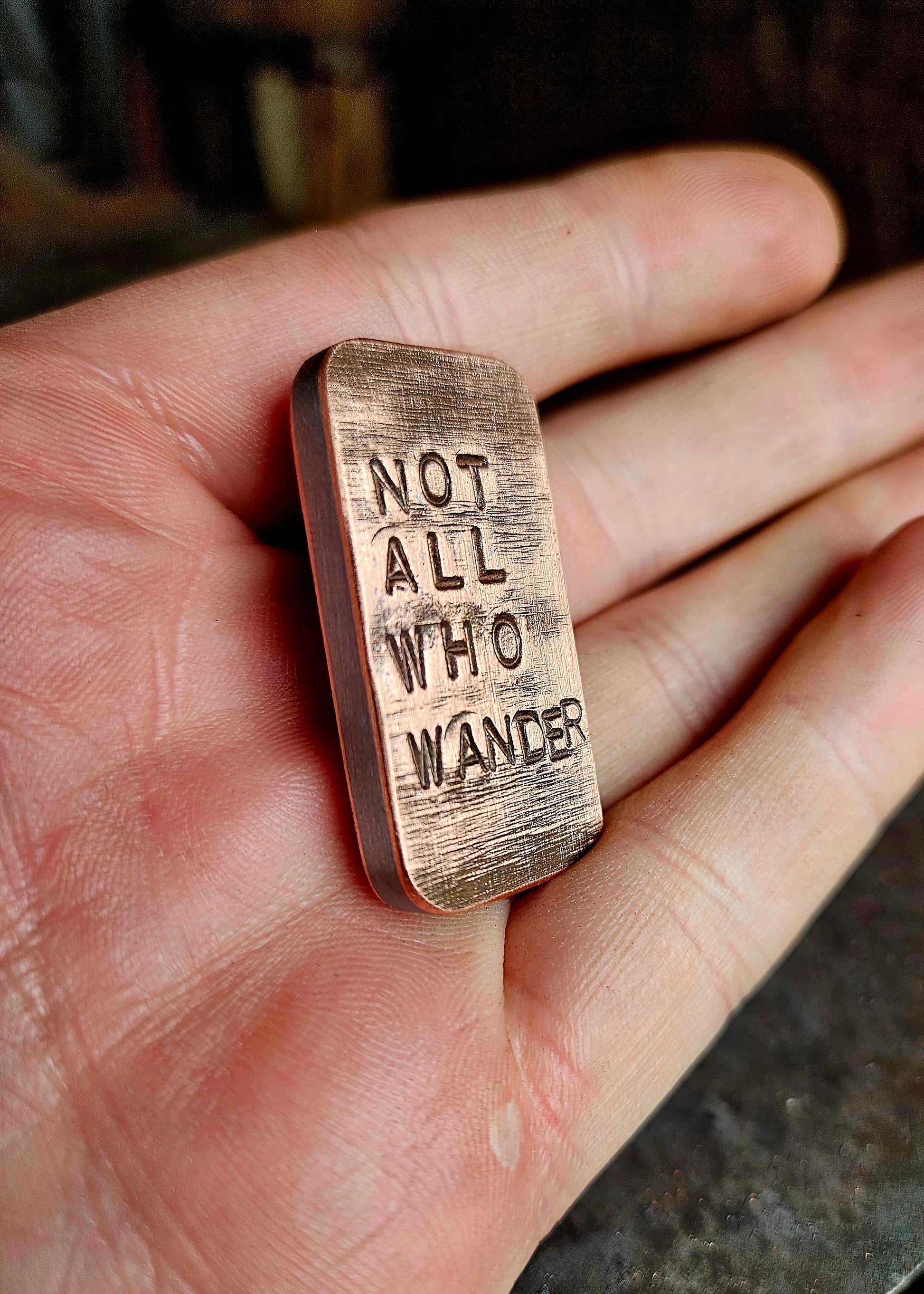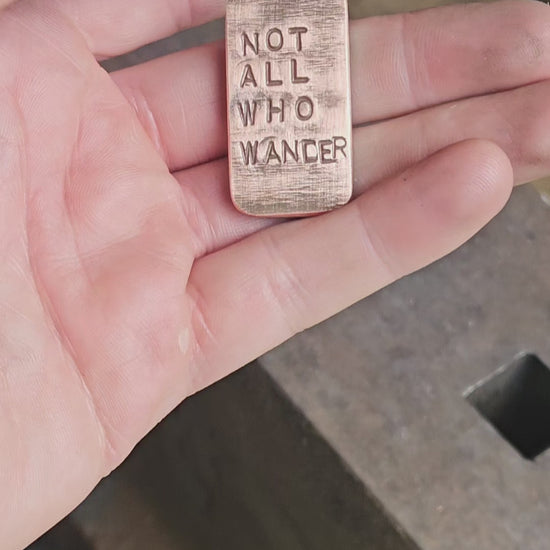 This particular stone has the words 'not all who wander are lost' hot stamped into the faces. This is a line from a poem written by JRRR Tolkien.
