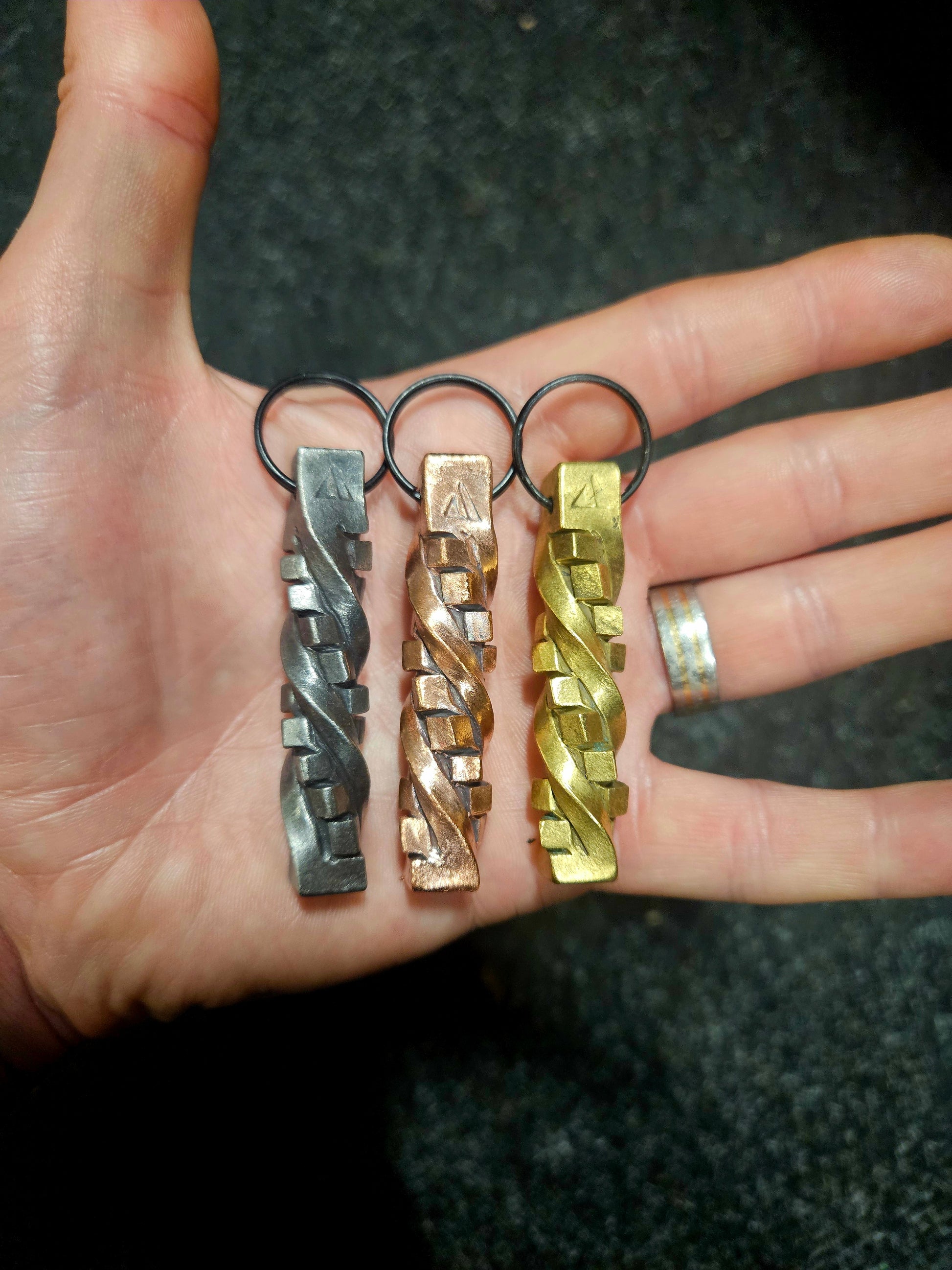 Made from steel, copper or brass and measures roughly 6cm in length. It features a Rubix style twist that is modern in design and feels very good in your pocket. Is rough enough to feel very tactile but not so much it hurts to hold!