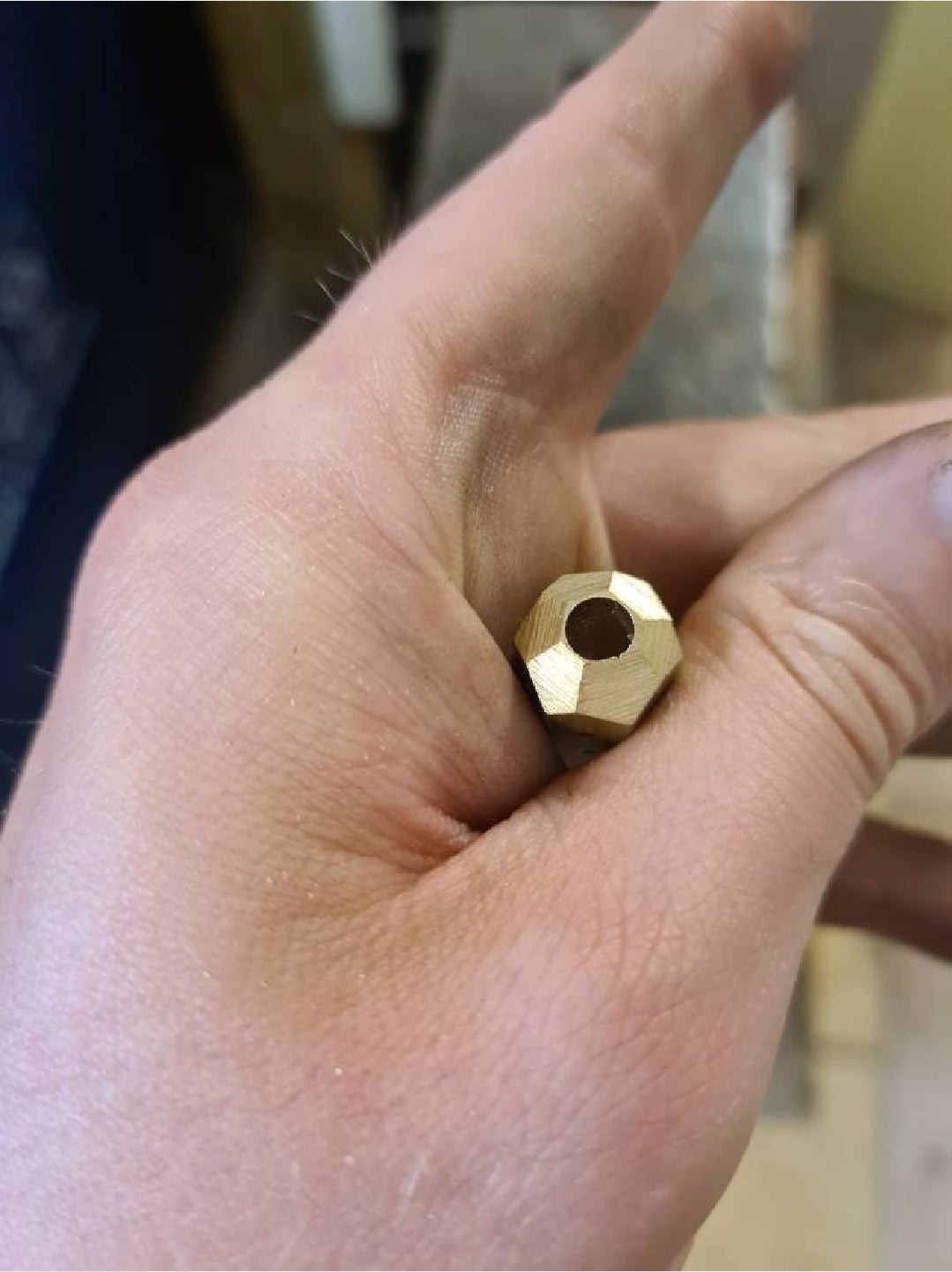 They are a hexagonal prism in shape with a 5mm hole drilled through the centre and the ends shaped like the pill shaped dice I make. The faces are stamped with round pips to mark the numbers.