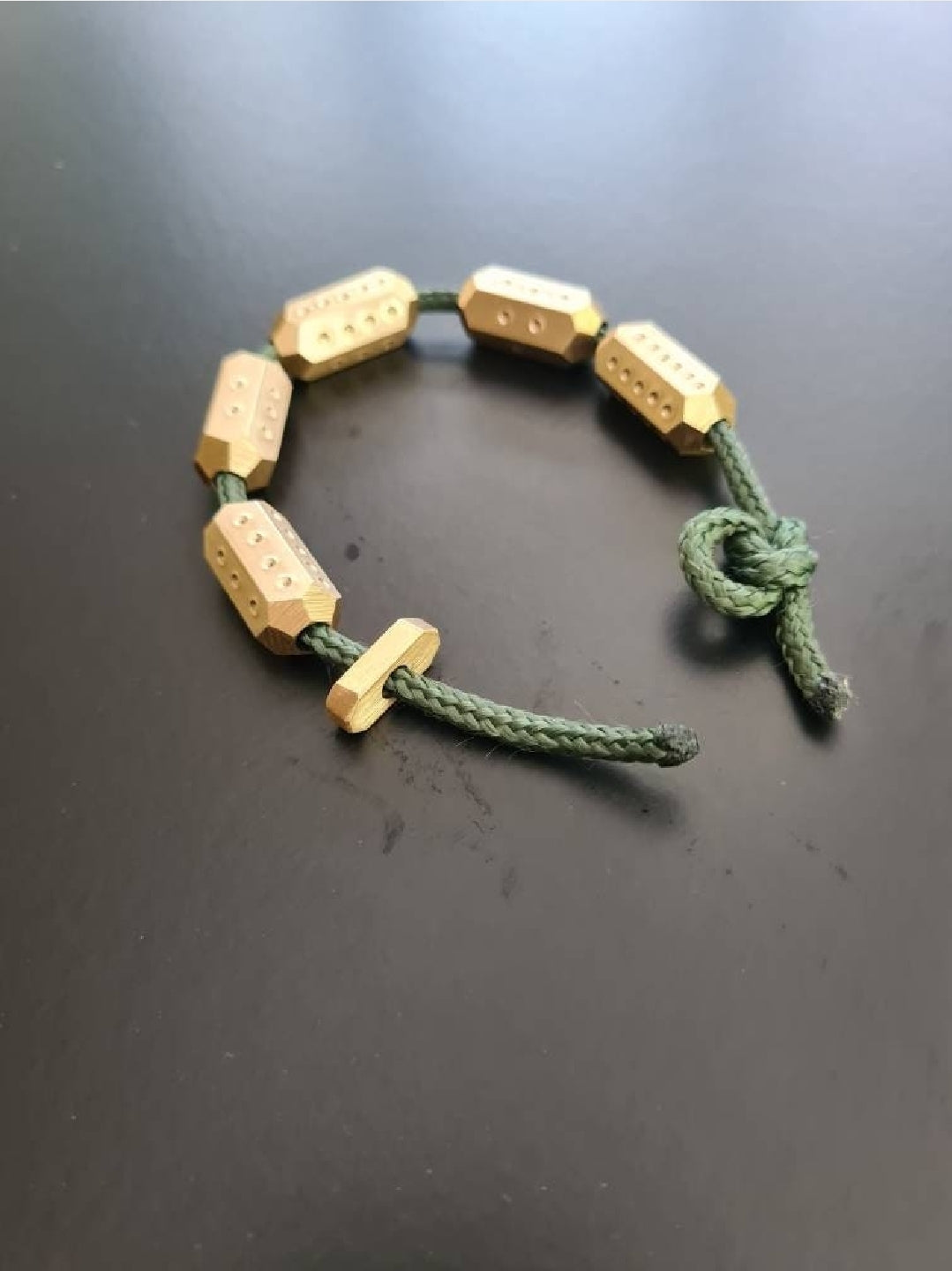 The dice are threaded on a length of paracord with a loop tied in one end that the brass toggle goes through. The toggle is held on by a simple half hitch.